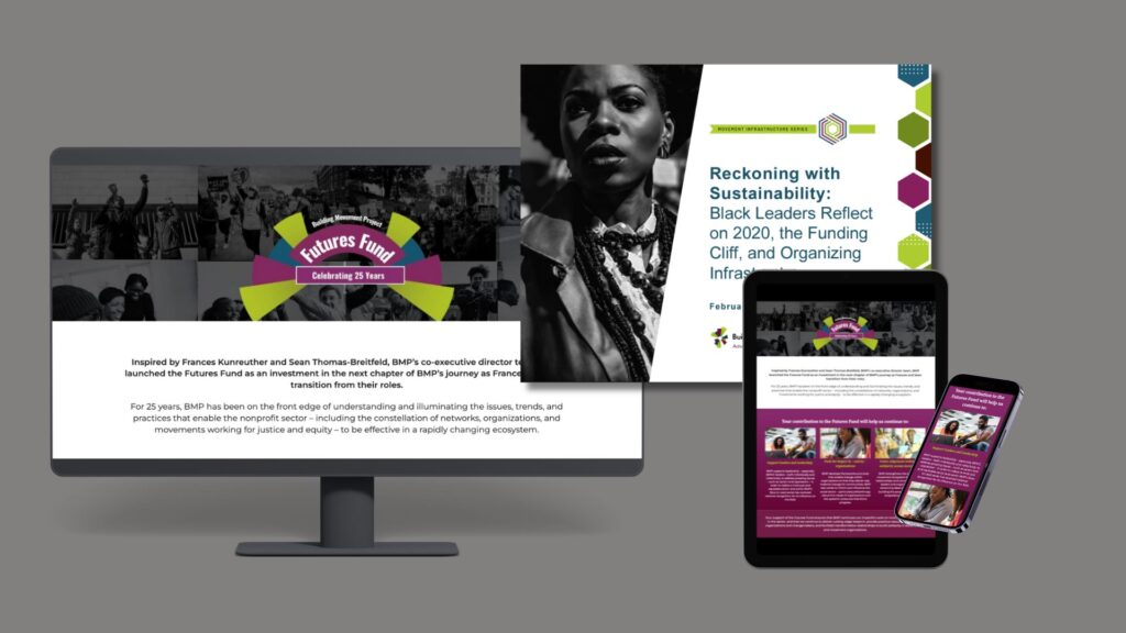 About The Building Movement Project (BMP) empowers the nonprofit sector to address today’s most pressing social issues. BMP achieves this by conducting in-depth research, developing practical tools and training materials, offering expert guidance, and fostering networks dedicated to social change. The Challenge The Building Movement Project (BMP) faced the challenge of effectively engaging with their audience and driving meaningful action through their digital platforms. Their existing social media presence lacked the cohesive design and strategic approach necessary to maximize impact. Additionally, their donation landing page was not optimized for conversions, resulting in missed opportunities for fundraising. BMP also needed a visually appealing and informative report design to communicate their research findings and insights effectively to stakeholders and the broader nonprofit community. The Solution We developed a cohesive social media design strategy that gave BMP a consistent, visually compelling presence across all platforms, making their content instantly recognizable and more engaging. We redesigned the donation landing page with a clean, conversion-focused layout and clear calls-to-action to encourage more contributions and reduce drop-offs. In addition, we designed multiple reports to present BMP’s research and insights in a visually engaging and accessible way, helping stakeholders and the broader nonprofit community easily absorb key findings. This integrated approach strengthened BMP’s digital presence, expanded the reach of their research, and increased fundraising opportunities. Results Through Our 1 1/2 Year Retained Partnership Increased Social Media Engagement: Our social media design efforts led to a noticeable increase in follower engagement, with higher rates of likes, shares, and comments. Enhanced Donation Conversion Rates: The redesigned donation landing page resulted in a significant boost in conversion rates, increasing both the number and amount of donations received. Improved Stakeholder Communication: The visually appealing report designs effectively conveyed BMP’s research findings, making it easier for stakeholders to understand and engage with the content. Strengthened Brand Presence: The cohesive visual identity across social media and digital platforms reinforced BMP’s brand presence and enhanced their ability to drive social change.